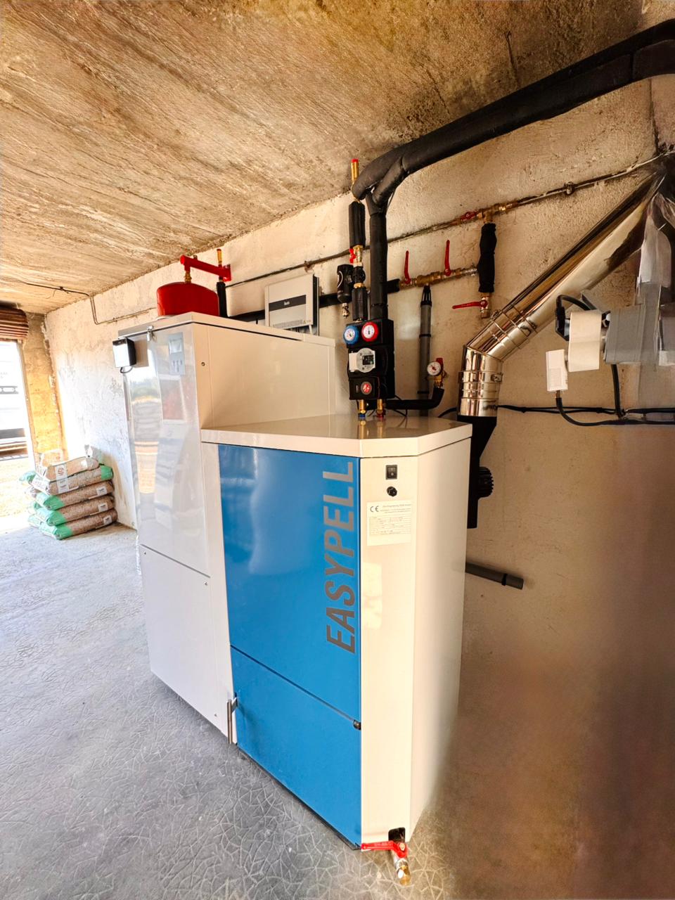 Le choix s'est porté sur une chaudière à remplissage par sacs, modèle EASYPELL, 12kW. En effet, les besoins de la maison étant limités, et l'espace disponible pour l'installation, il n'est pas apparu contraignant pour les clients d'avoir recours à des chargements de sacs hebdomadaires.