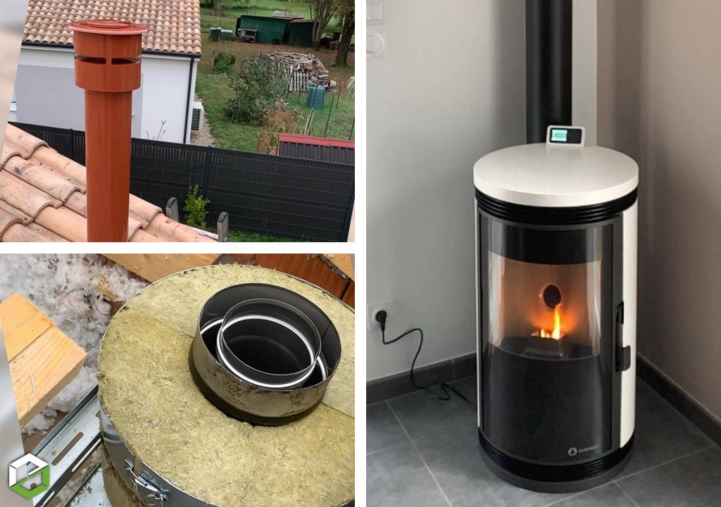 Nous avons eu recours à l’installation d'un conduit double flux (assurant évacuation des fumées et prise d'air de combustion par le même tuyau), compatible avec les appareils étanches, et opté pour une sortie de toit couleur rouge brique afin de rendre le terminal en toiture le moins visible possible. C'était un souhait du client, et nous sommes capables de faire réaliser les pièces avec un coloris au choix.