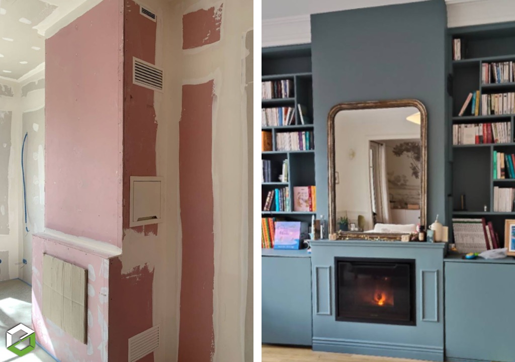 Notre client avait une idée bien précise de son aménagement intérieur, et il souhaitait y associer un insert à granulés, pour mixer ses sources de chauffage.