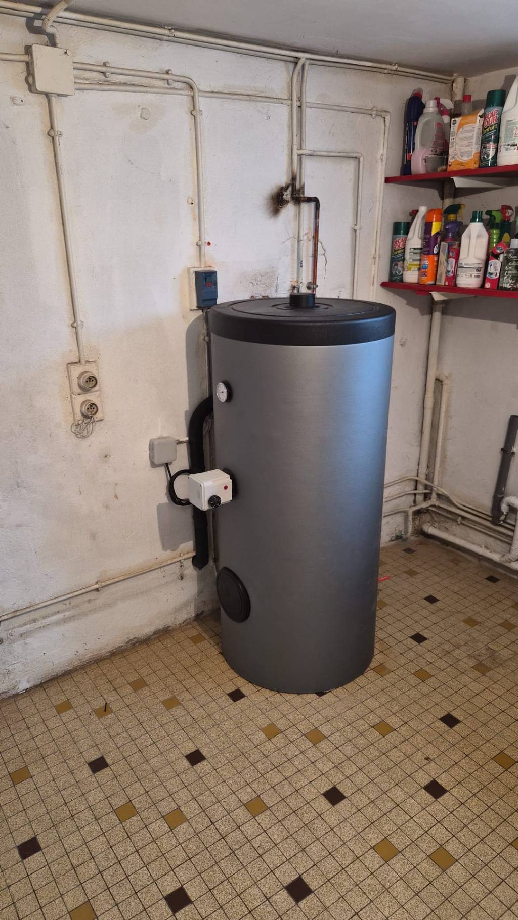 La régulation et la chaudière permettent aussi de chauffer de l'eau sanitaire. Un petit ballon de 200L avec une échangeur suffira aux besoins de la maison. Nous l'avons également équipé d'une résistance électrique, pour assurer la production d'eau chaude hors saison de chauffe, ou pendant les phases d'entretien annuel de l'installation par exemple.