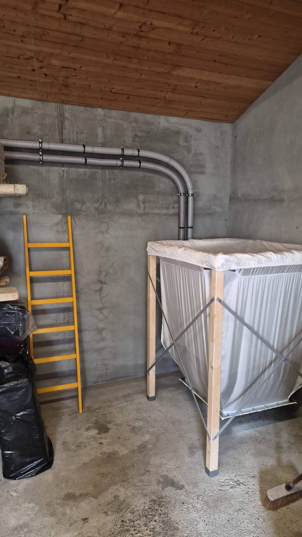 Nous lui avons associé un petit silo à remplissage par sacs. Salut contenance est de 650kg et permet une belle autonomie au client. Il pourra faire évoluer facilement son installation vers un silo plus contenant dans le futur.
